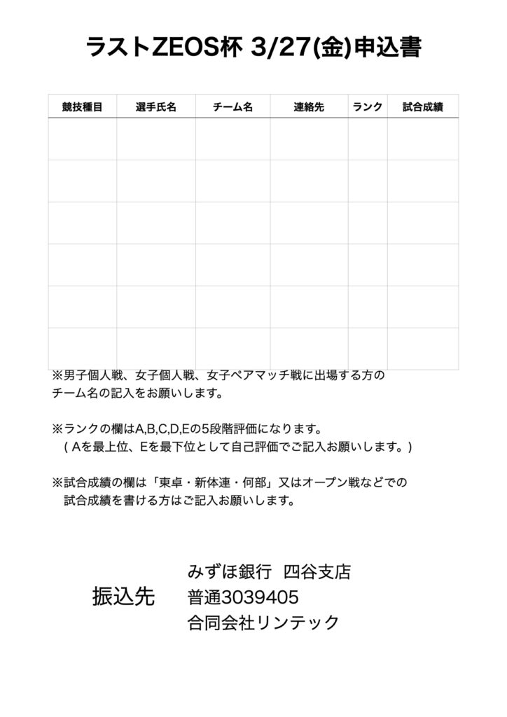 ZEOS杯のお申し込みについてのご案内です。